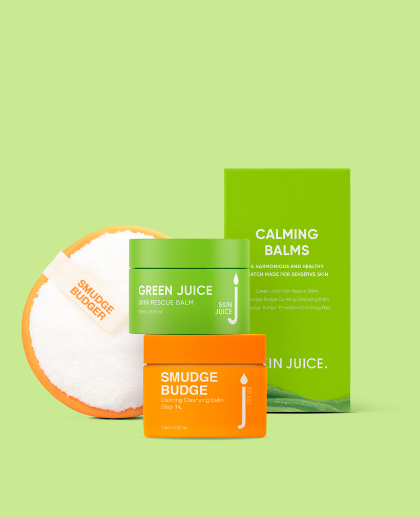 CALMING BALMS is a harmonious and healthy match made for sensitive skin. A soothing duo of Smudge Budge Calming Cleansing Balm and our superstar Skin Rescue Balm, Green Juice. Also includes a Smudge Budger Microfibre Cleansing Pad. Comfort and relief for your skin. A gentle touch.