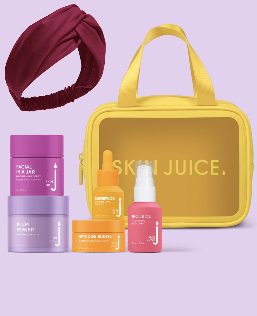Plum Power Whipped Clay Mask + Facial In A Jar Brightening Berry + Smudge Budge Mini Calming Cleansing Balm + Bio Juice Mini Hydrating Skin Drink + Superfood Mini Brightening Face Oil + Velvet Headband + FREE Yellow Cosmetic Bag