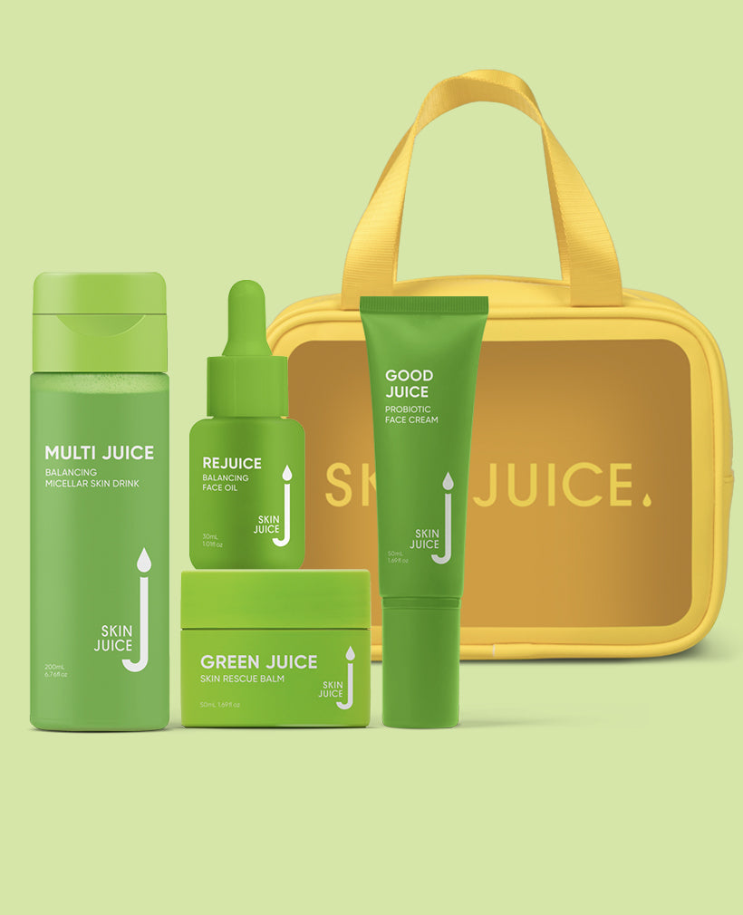 Multi Juice Balancing Micellar Skin Drink + Rejuice Balancing Face Oil + Green Juice Skin Rescue Balm + Good Juice Probiotic Face Cream + FREE Yellow Cosmetic Bag