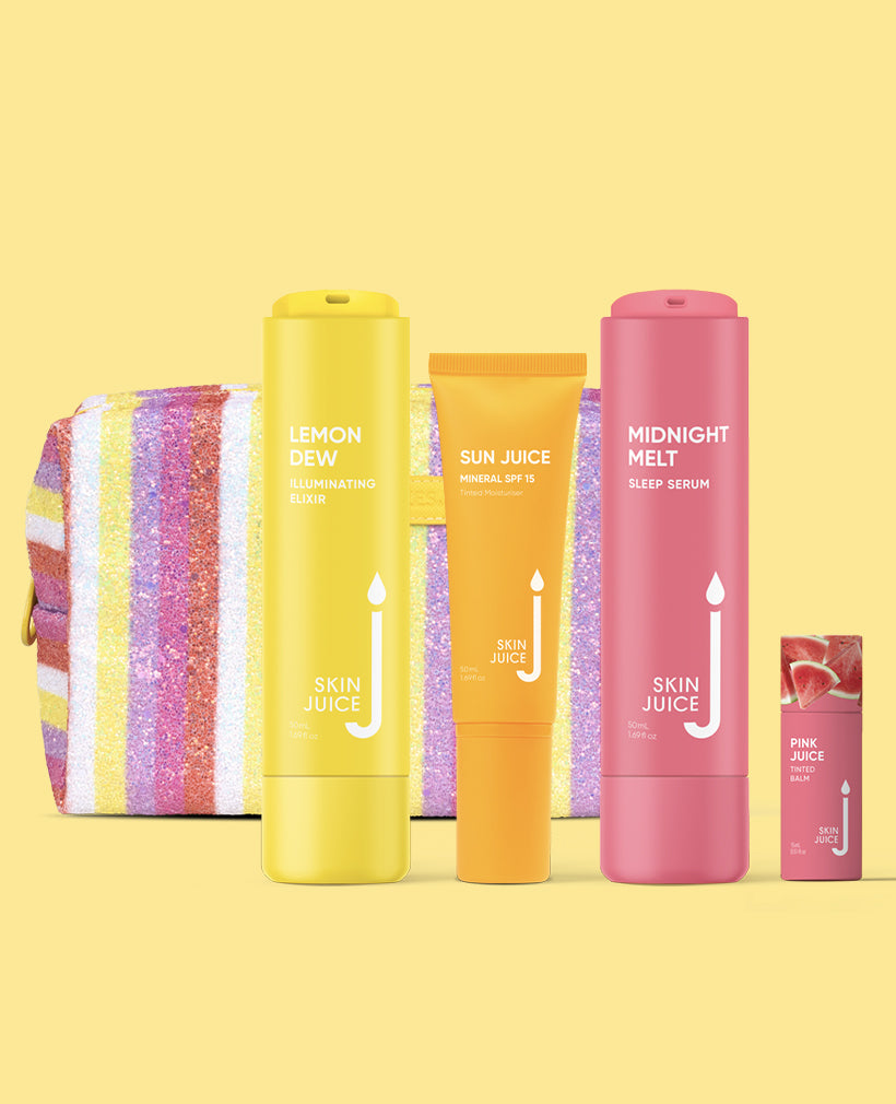 Lemon Dew Illuminating Elixir + Midnight Melt Night Treatment + Sun Juice Tinted Moisturiser with SPF 15 + Pink Juice Tinted Balm + FREE Pure Sparkle Travel Bag