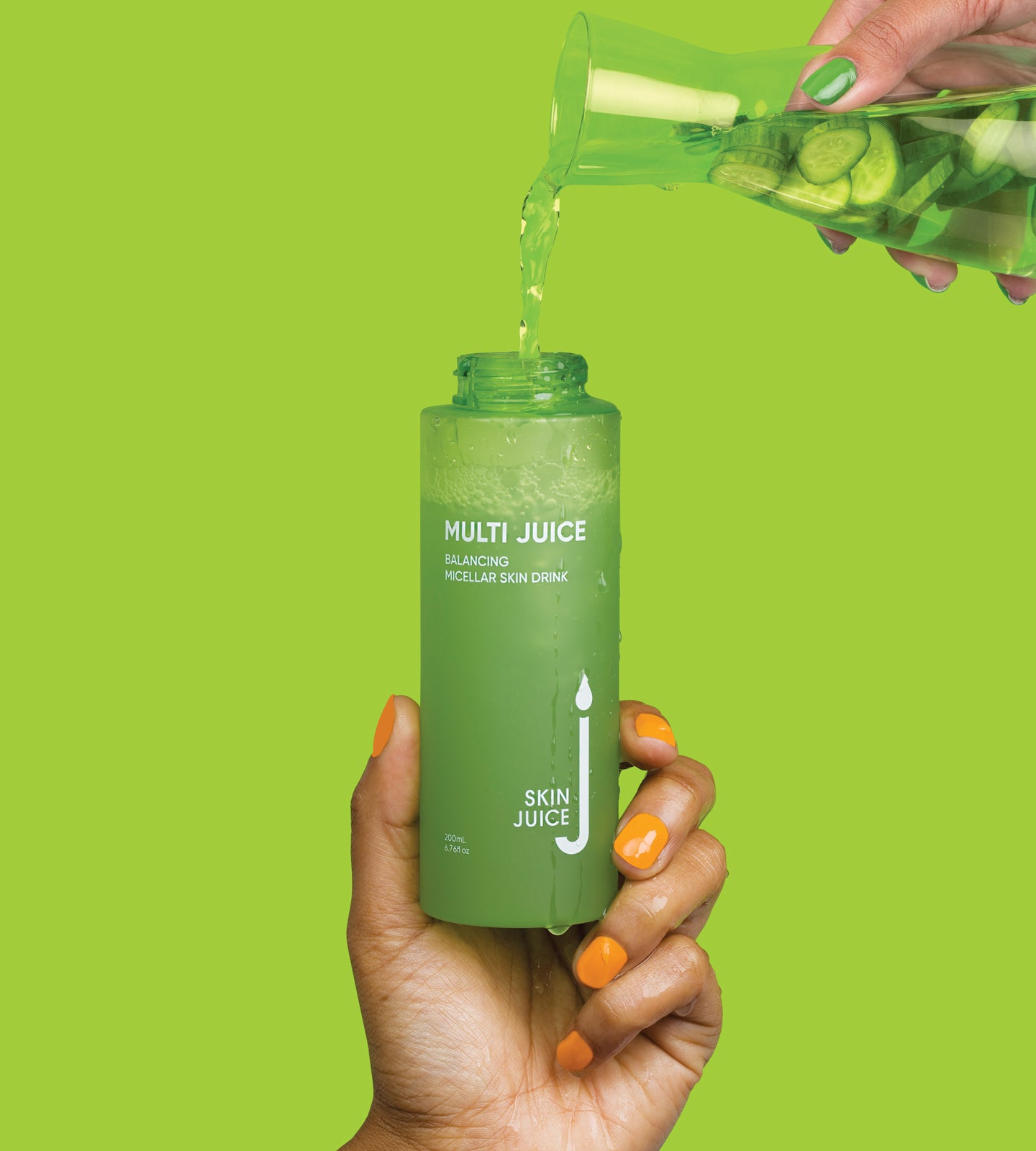 MULTI JUICE is a zesty micellar skin drink to refresh, cleanse, balance and hydrate skin in one easy step.