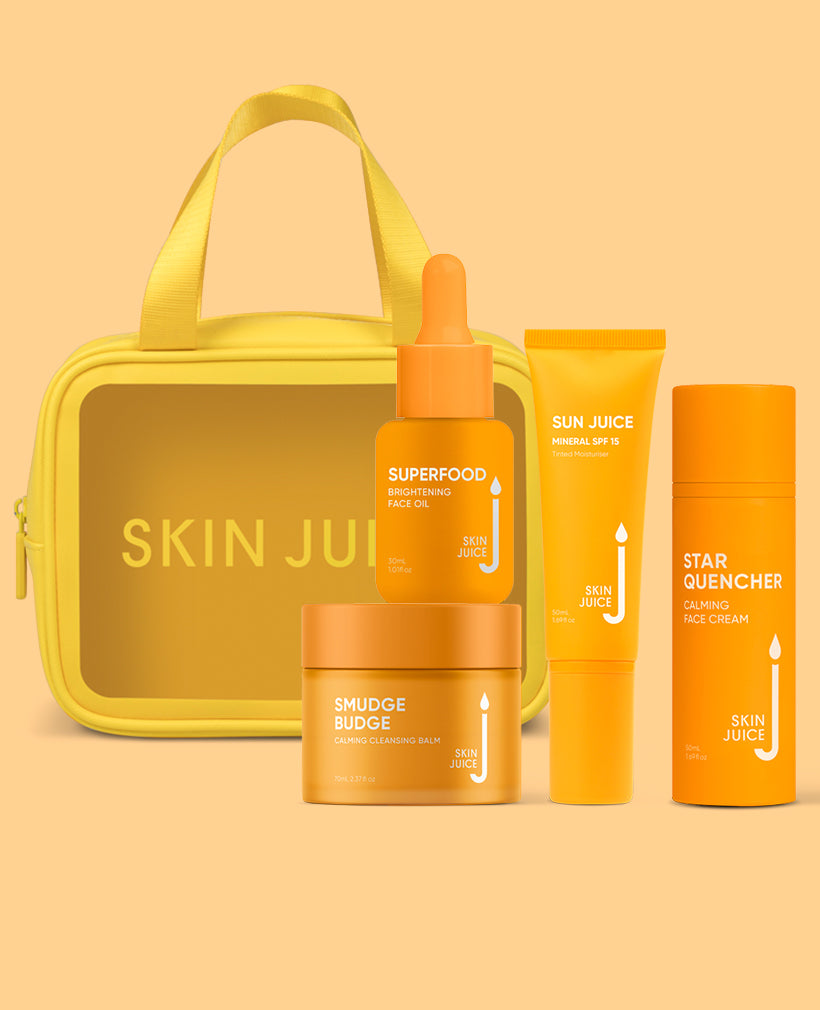 Smudge Budge Calming Cleansing Balm + Sun Juice Tinted Moisturising SPF + Superfood Brightening Face Oil + Star Quencher Calming Face Cream + FREE Yellow Cosmetic Bag