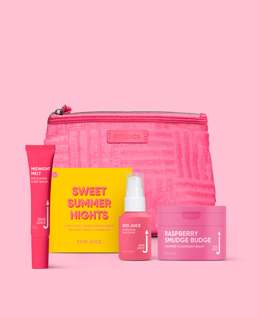 A trio of juicy, sorbet-scented squeezes for a sweet finish to a summer day. Follow the recipe for a blissful bedtime melting moment and wake up to dreamy, juicy skin. All packed into a fun Raspberry Fuzz travel bag.